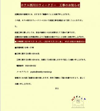 タイトルの通り11月上旬ホテル西川口ウィークリー改装工事を行います。